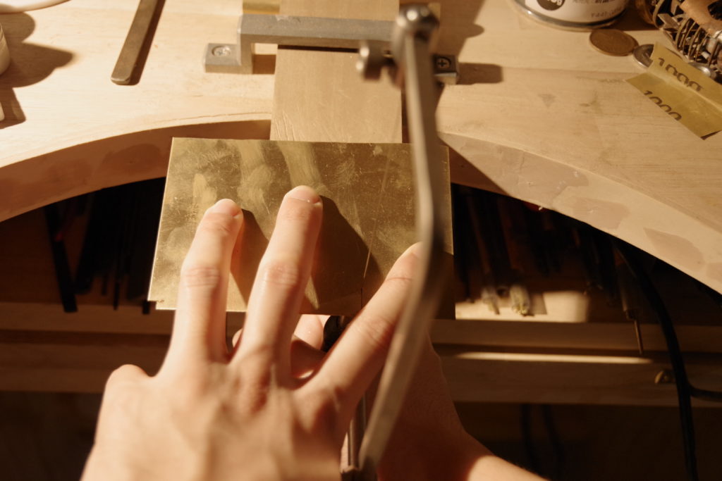 大の字の横棒の部分は折り返して輪にしますので長めに切り出しておいて余分をあとでカットした方が失敗がありません。マジックで真鍮板に書いて、それに合わせてくり抜きます。