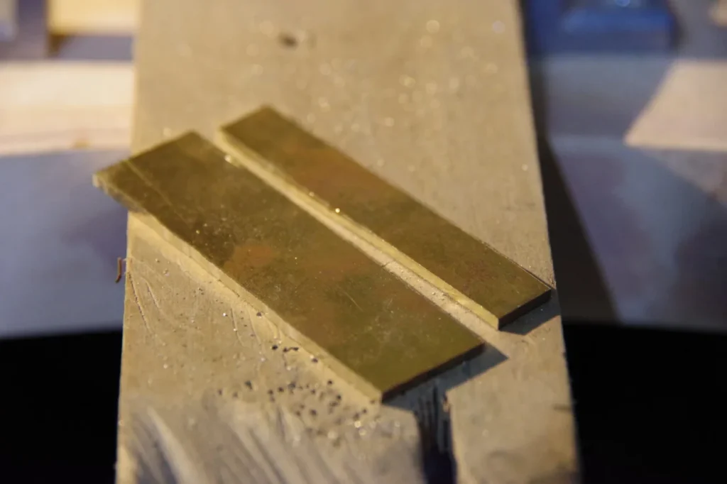 少々切るのに苦労しますが、糸鋸(サイズ#0の刃を使用)で真鍮板を切断していきます。あらかじめ印の線を入れておくと正確にカットすることができます。