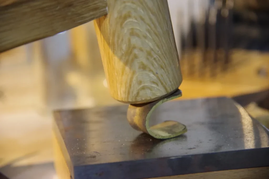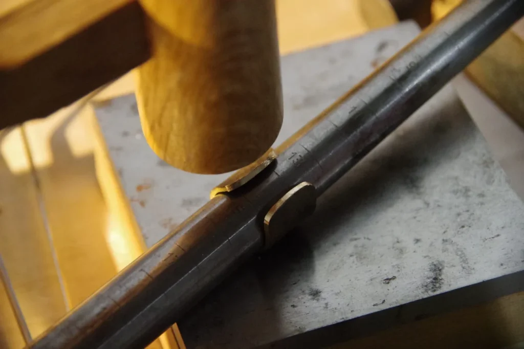 端を丸くするときは芯金棒に突っ込んだ状態で木槌で叩きます。作りたいサイズのマイナス#0.2くらいを狙ってください。