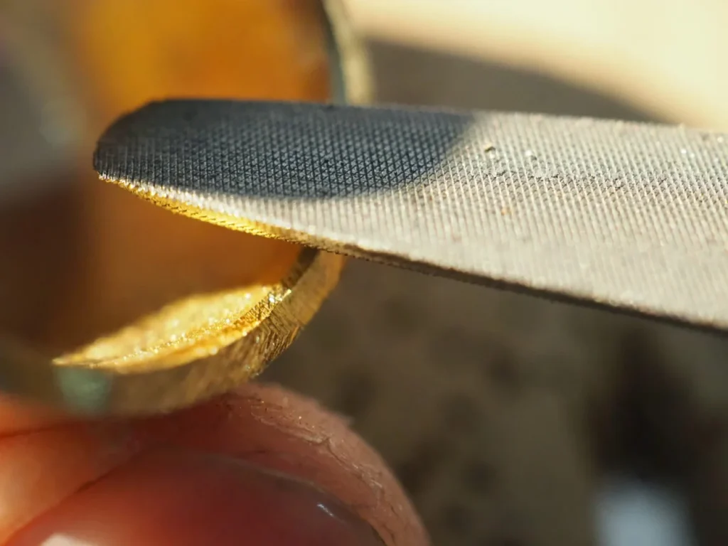 細い丸ヤスリなどを使って、縁を波状にしたり、ギザギザにしたり…などのアレンジはここの工程で行うのが良いかと思います。