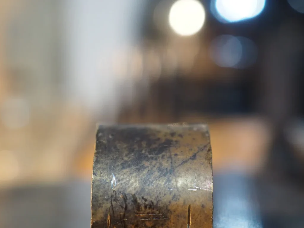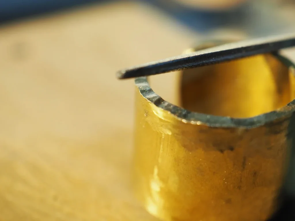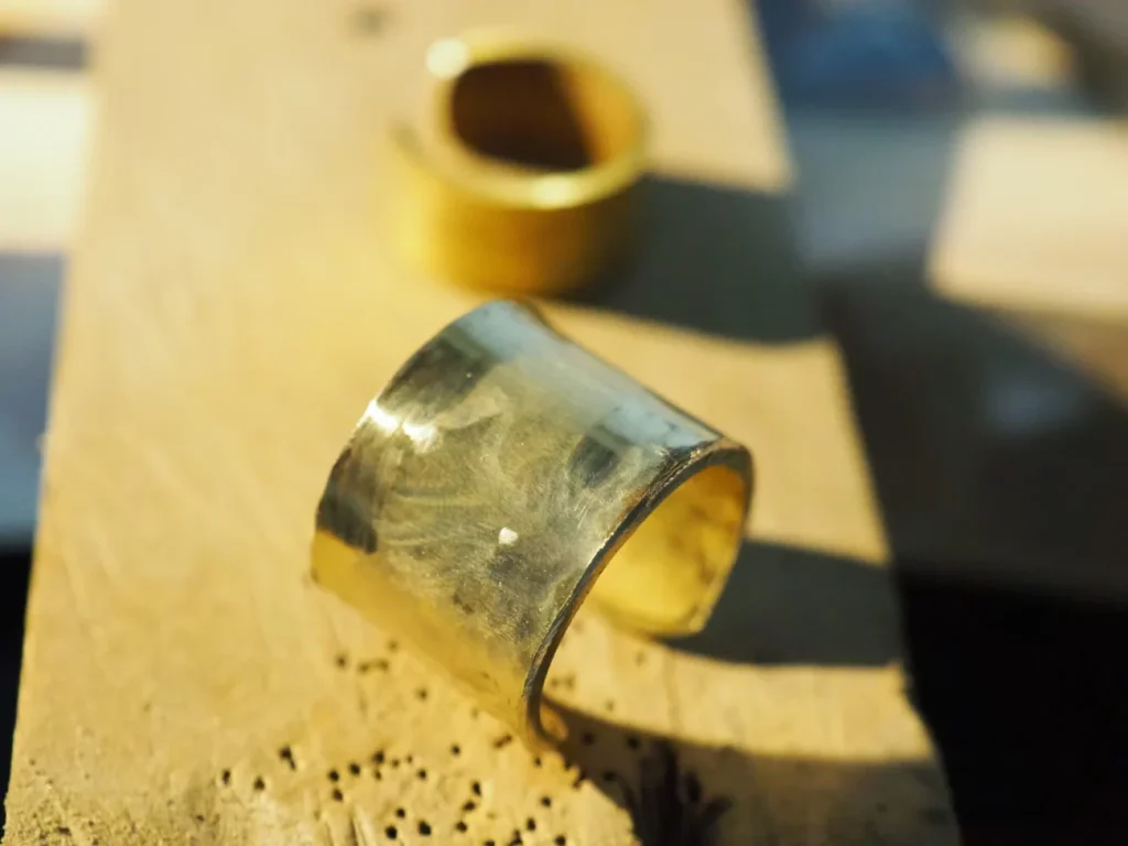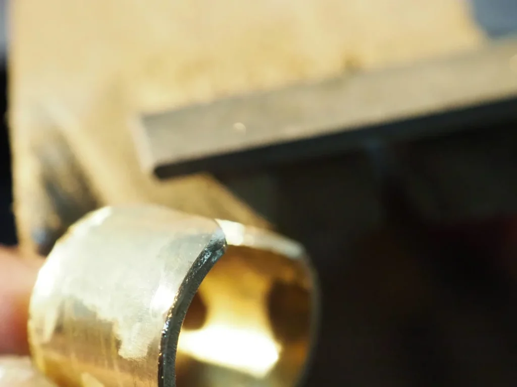 通常のリングを作る際はこれを真っ直ぐヤスリで一周削って整えるのですが、その分板厚が薄くなってしまいます。