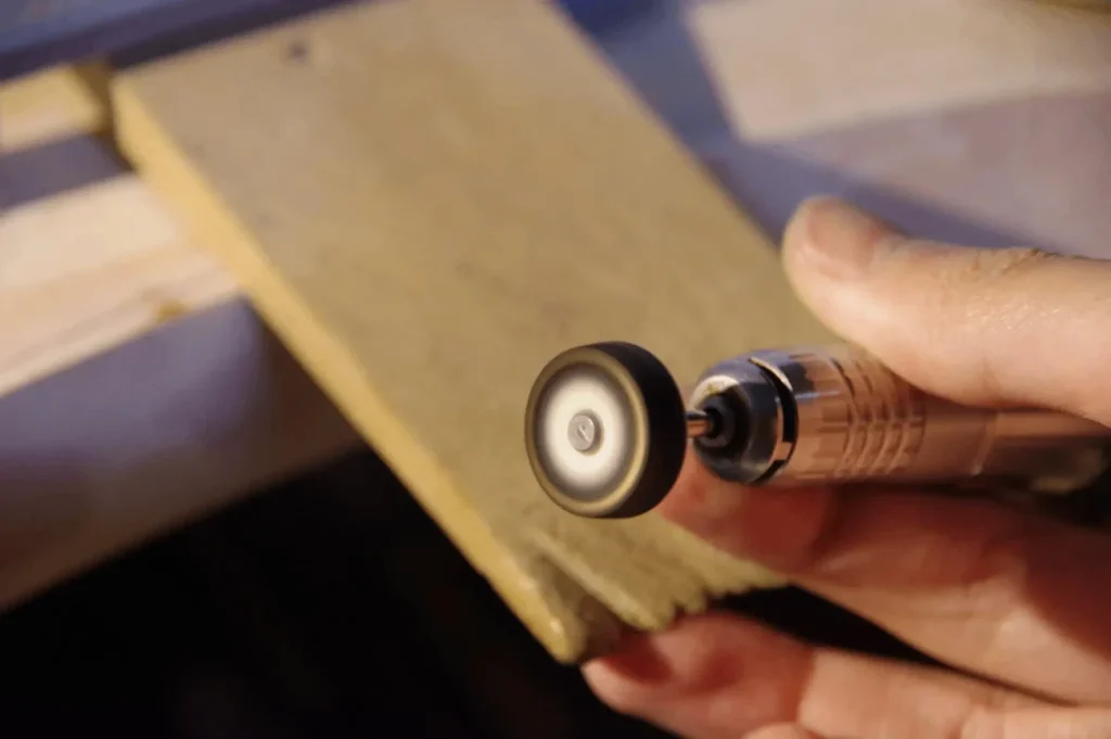 リューターの場合は、ペーパーロールサンダーという軸に耐水ペーパーを取り付けたものを使います。(道具屋でも1コ150円くらいで売っていますが、自分で作れば1コあたり数十円です)