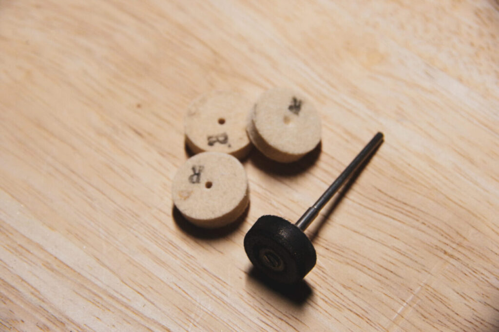 マンドレールという先がネジになっている軸にフェルトホイールを取り付けて使います。