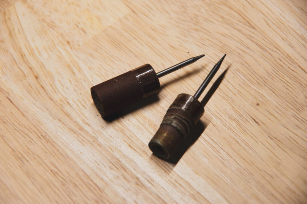 紙ヤスリやリューターに取り付けられる紙ヤスリを巻いたポイント(ペーパーロールサンダー)で、鉄ヤスリの傷を消していきます。