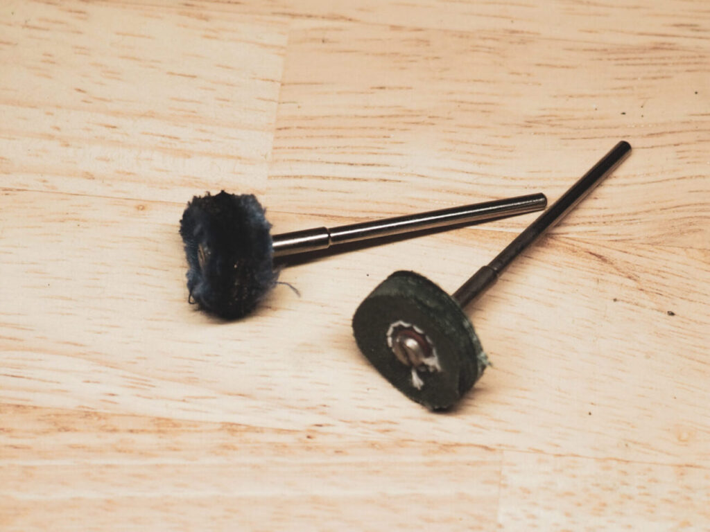柔らかい布のついたバフ(リューター用は豆バフと呼びます)に仕上げ用の研磨剤をつけて磨いていきます。