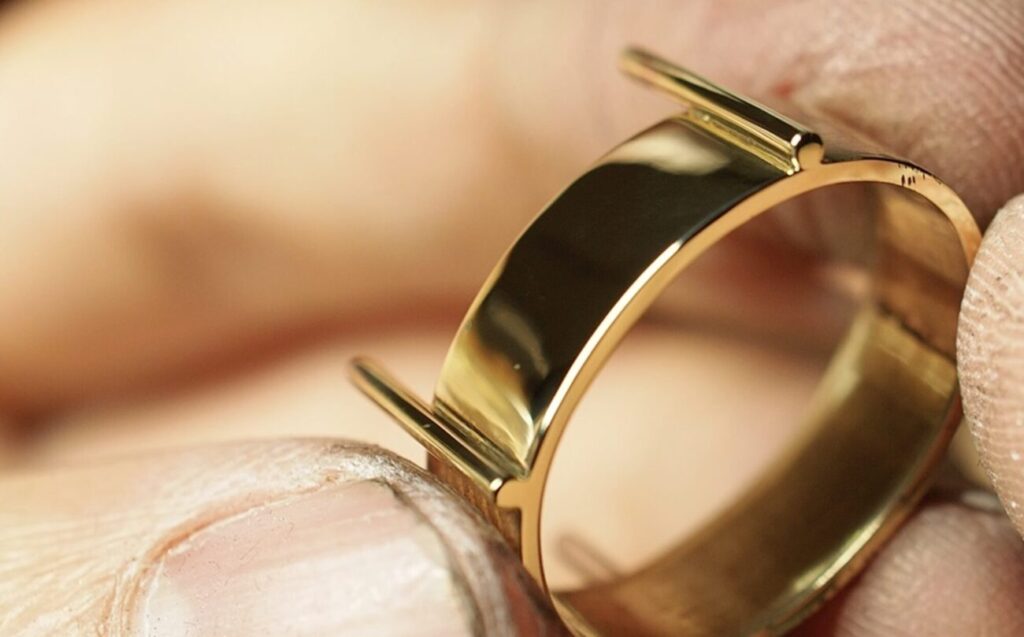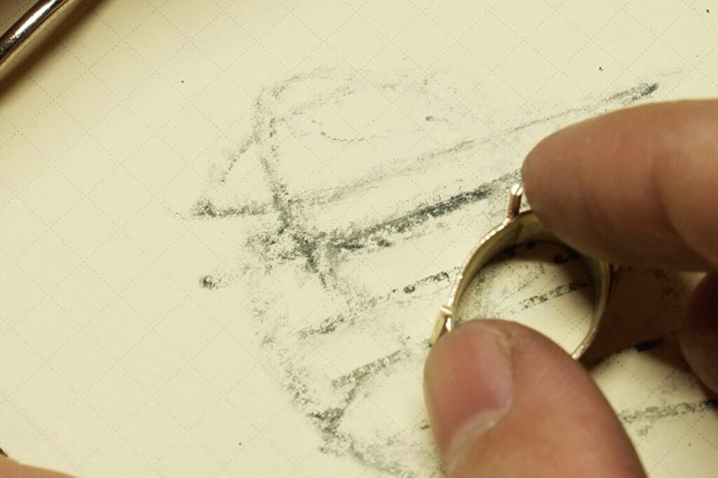 メラメラ…というのはボコボコの鏡のような、光が乱反射してしまうような感じです。光に当てつつ作品を左右に振ると、光沢が炎のメラメラのように見えます。ローカル表現かもしれませんがジュエリー職人の間では、メラついてるとかメラメラしているなどと呼ばれています。)