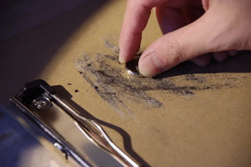 100円ショップでも売っているMDF材のバインダー(木のくずを固めたようなもの)に荒い(#4000/中目程度)固形研磨剤をつけて、8の字を描くように擦ります。