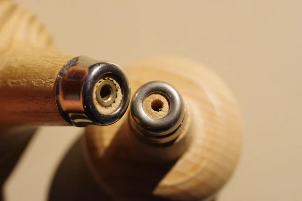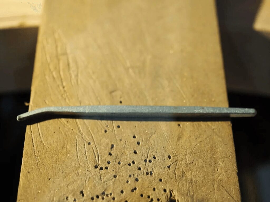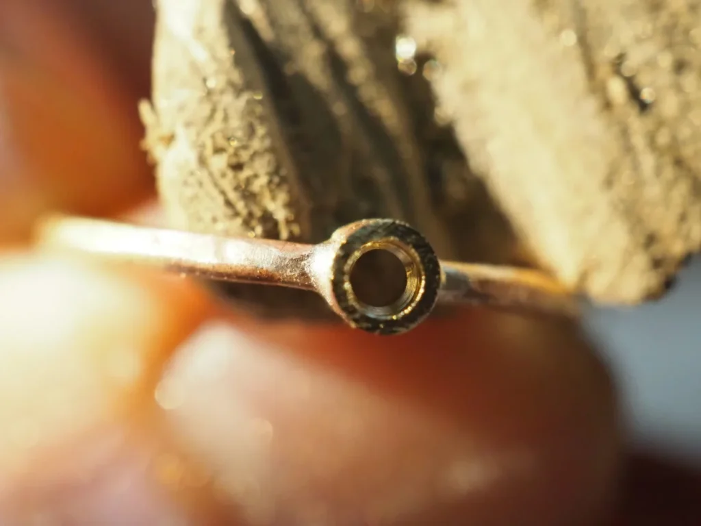 いつものように芯金棒に入れて木槌などで叩いていくわけですが、叩きまくるとどんどん波長が緩くなって、サイズがどんどん大きくなってしまっていますのでご注意ください。軽く歪みをとるくらいでやめておきます。
