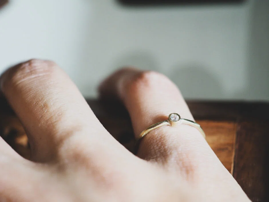 二段腰は、華奢で繊細な雰囲気を与えられる他、光がいろいろな方向から差し込むので、石がキラキラして見えます。