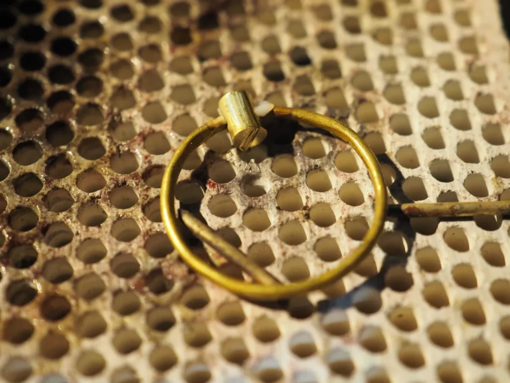 バーナーで加熱してロウがバターの様に流れてきたら、リングののりしろ部分にフラックスを塗って、ピンセットで付けたい位置にセットします。