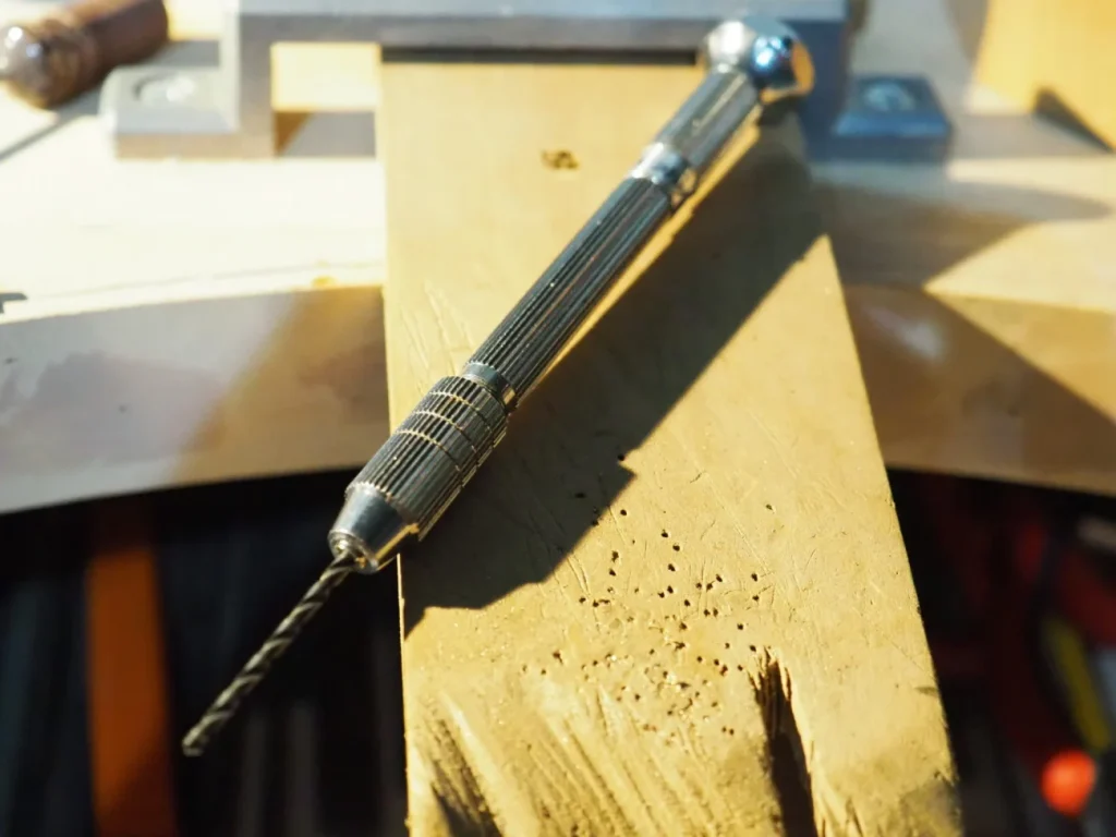 細めのドリル刃をつけたピンバイスで、糸鋸が外側からアクセスできないところに穴を開けます。