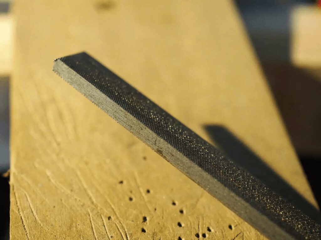 精密ヤスリの角で同じ方向にヤスリ目をつけていく